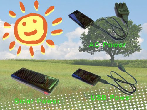 Brand New Solar Power Charger for cell phone/PDAIt's a 1200ma battery that can be charged by solar power; AC power and USB.Simply put it under sunlight and it will automatically be charged.After charged; it can supply 5V/1A power to different devices like MP3/MP4/Cell Phone/PDA..etc.Plug and charge; no setting is needed.Items in the box: 1x 1200ma solar charger battery; 1x AC adapter(for your country); 1x USB cable; 1 X Nokia AC-1 adapter; 1x Nokia AC-3/AC-4 adapter; 1x Sony Ericsson CST-60 Cable; 1x mini USB adapter; 1x Universal USB adapterWith the Universal USB adapter; you would charge any device with your own USB cable.Read more 1976O515 Solar Power charger for Mini USB Cell Phones/PDA/Nokia Cell phone/Nokia Cell Phones/PMP MP3 MP4 player/Sony-Ericsson Phones